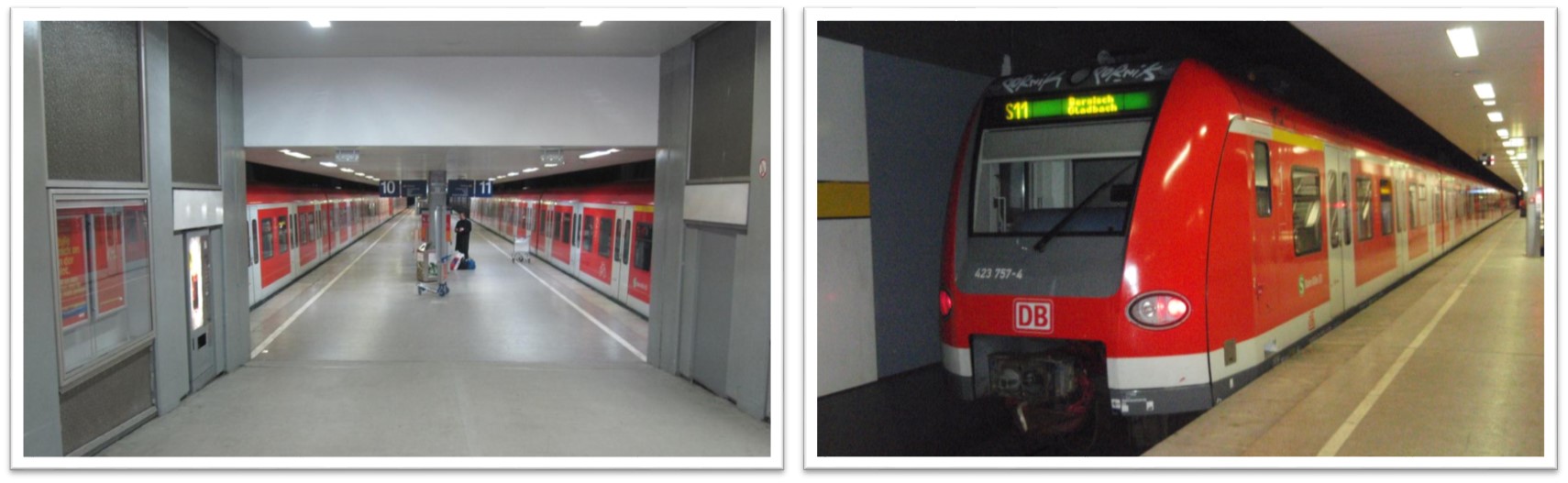 Beres dengan imigrasi dan bagasi, kami mulai mencari stasiun kereta S-Bahn Line 11 di dalam bandara. Menurut saran di forum Tripadvisor, letaknya ada di basement. Mula-mula kami mencari restaurant Mc Donald, yang ternyata cukup mudah ditemukan. Di depan restaurant itu ada elevator landai yang tak berundak menuju ke lantai bawah. Sampai di bawah agak kebingungan karena hanya nampak ruangan kosong. Kami berjalan terus melewati pintu sekitar 200 meter, baru nampak peron stasiun.