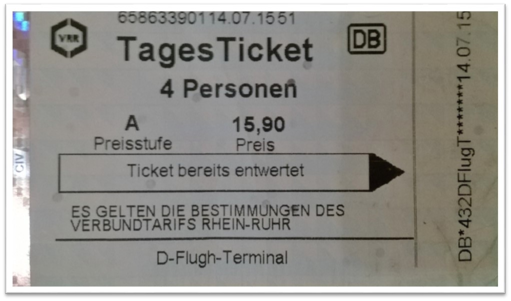 Di sana terlihat 2 vending machine ticket berjajar. Kami harus membeli Day ticket (Tageskarte) untuk grup yang terdiri dari 4 orang seharga 15,9 Euro. Harga grup tentu saja lebih murah daripada beli satuan. Tiket itu berlaku untuk tujuan Duseldorf Flughafen ke Dusseldorf Hauptbahnhof dan berlaku juga untuk keliling-keliling naik kereta,trem dan bis di kota Dusseldorf seharian.