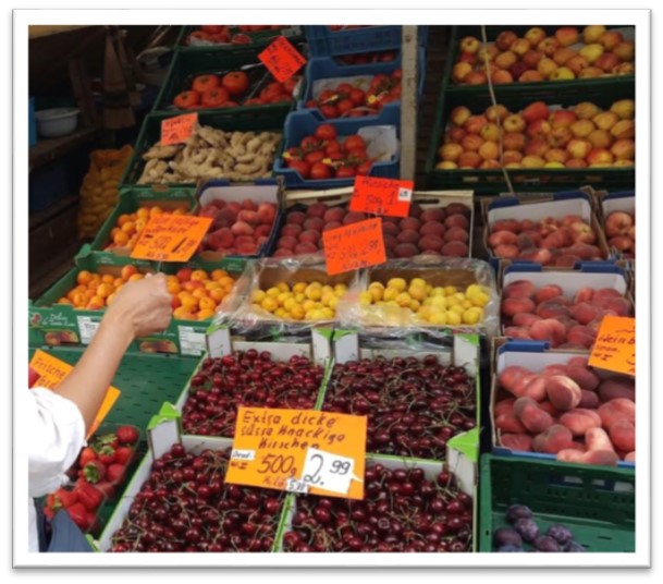 Masih keliyengan setelah turun dari kereta gantung, kami dibawa ke mall terbesar di Wuppertal. Itu kata mereka. Tapi mall terbesar di Wuppertal ternyata hanyalah seukuran mall terkecil di Bekasi. Barang-barangnya juga gak up to date. Entah mengapa kami dibawa ke mall ini. Saya malah tertarik dengan pedagang di luar mall. Salah satunya adalah pedagang buah. Aaaaah segar dan ranumnya buah yang dijual. Saya tidak dapat menahan diri membeli setengah Kg Cherry yang harganya cuma 2,99 Euro. Bayangkan kalau buah ini sampai di Jakarta, 100 gramnya harganya 40 ribu.